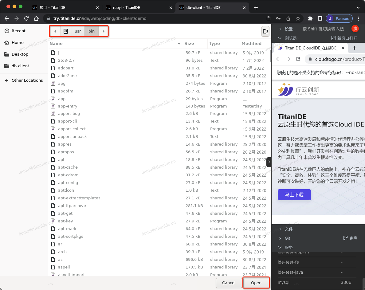 TitanIDE 在 /usr/bin 文件夹下面内置了 mysql 客户端,因此选择 /usr/bin 后点击 【open】按钮。