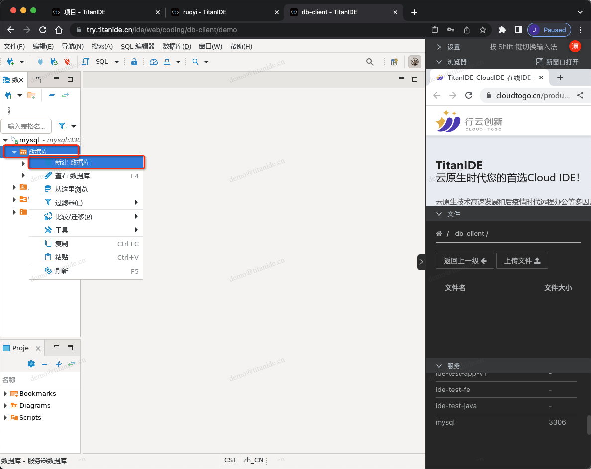 最近,我在使用 TitanIDE 开发云原生应用的时候,需要一个客户端操作数据库,我们一般都会在自己的电脑安装 NaviCat、Workbench、DBeaver 等数据库客户端工具。这些工具都挺好用的。不过呢,NaviCat 想说爱你不容易,虽然MySQL Workbench 是免费的,但是仅支持 MySQL。最后找到了 DBeaver,发现 DBeaver 通过 JDBC 连接到数据库,可以支持几乎所有的数据库产品,还开源、免费。但问题是,TitanIDE 是运行在云端,通过浏览器来访问的,而以上工具皆运行在本地桌面操作系统内部,一个在云端,一个在本地,TitanIDE 和 DBeaver 是怎么坠入爱河的呢?且听我娓娓道来......
