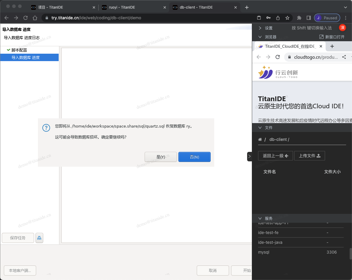 您即将从 /home/ide/workspace/space.share/sql/quartz.sql恢复数据库ry。这可能会导致数据库损坏。确定要继续吗?我们是新创建的数据库,当然安全,请点击 【是】按钮。