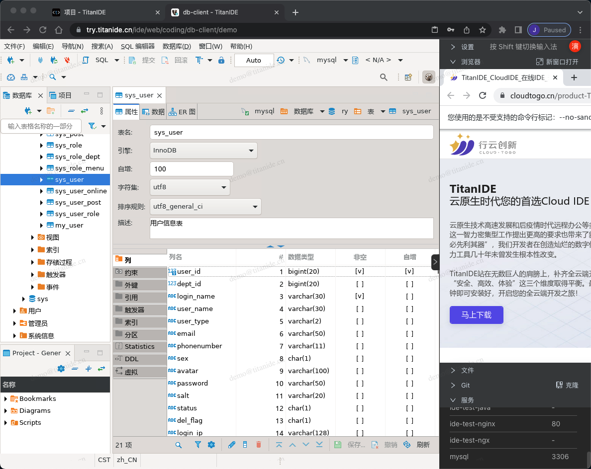 在创建新的数据库连接时,以下标红色部分需要注意,服务器地址填写 mysql是因为 MySQL部署在 DBeaver 同一个开发空间 demo,在右下角的服务列表有提示服务名称和端口号,点击服务名称即可复制并粘贴到服务器地址栏,认证填写连接数据库的用户名和密码,在 Advanced 区域,有个本地客户端,需要指定本地客户端所在的目录,为什么需要配置这么一个客户端呢,因为在导入数据的时候需要用到。在上面有提到,TitanIDE 在 /usr/bin 项目默认安装了 mysql的命令行客户端,如果是其他的本地客户端,仍然可以通过右侧栏的文件上传工具上传到 DBeaver 的工作区,然后在本地客户端下拉浏览找到您上传的客户端。