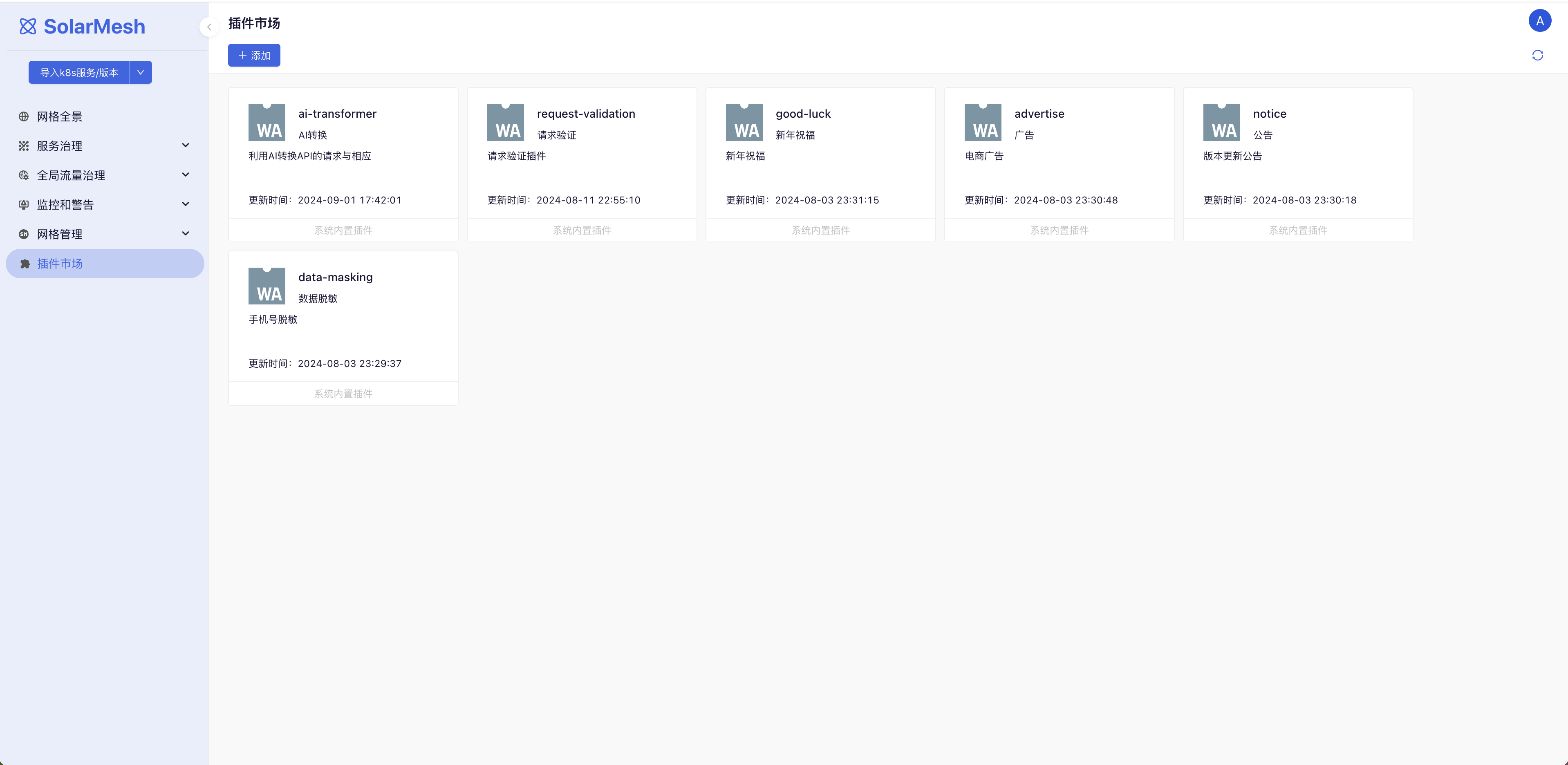如果你们自己也开发了wasm插件,那么也可以通过点击添加插件将插件上传到SolarMesh中。