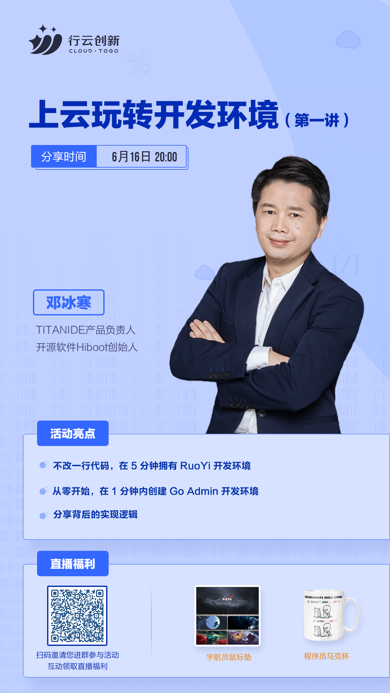 6月16日20:00,“上云玩转开发环境”第一讲即将开启!jiuyou.comom创新 TitanIDE 产品负责人邓冰寒将分享:如何利用 TitanIDE 在不改一行代码情况下,在5分钟拥有 RuoYi 开发环境;如何从零开始,在1分钟内创建 Go Admin 开发环境;以及分享这背后的实现逻辑。直播间还会送出宇航员鼠标垫、程序员马克杯等福利,快扫码参与活动吧~